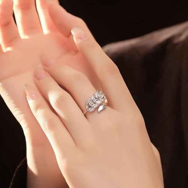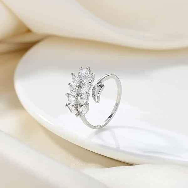 This silver wheat ring is a nature-inspired masterpiece, featuring a shimmering marquise cut band that transitions into a flexible bypass adjustable jewelry design. Crafted for those who find peace in the beauty of the outdoors, the intricate leaf-like stones wrap around your finger with a delicate grace. You will feel a sense of calm and confidence wearing this piece, as its polished finish catches the light and adds a high-end glow to your look.