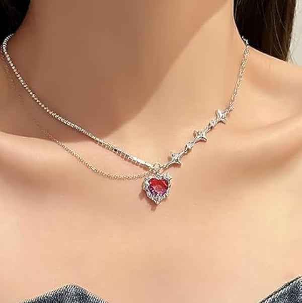 Purple, Heart, Star Transform your look with the refined beauty of our Purple Heart Star Necklace. This multi-strand accessory features a polished Silver link chain adorned with celestial star motifs alongside a parallel strand of shimmering rhinestones. At the center of this ensemble hangs a captivating Purple and pink gradient crystal Heart pendant, secured by a detailed metallic frame that adds a touch of modern mystery to the design.